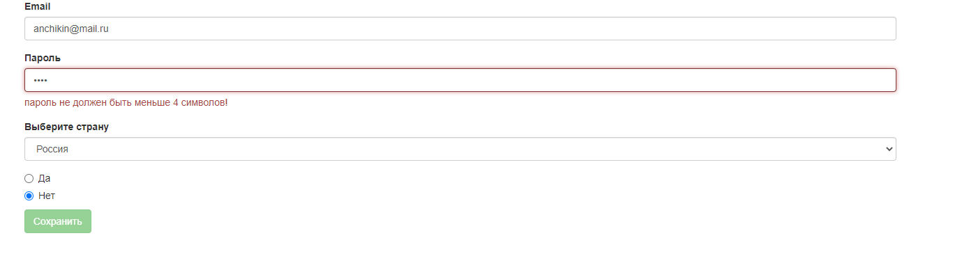 <div class="col-xs-8 col-xs-offset-2"> <form [formGroup]="form" (ngSubmit)="onSubmit()"> <div formGroupName="user"> <div class="form-group" [ngClass]="{'has-error': form.get('user.email').invalid && form.get('user.email').touched}"> <label>Email</label> <input type="text" class="form-control" formControlName="email"> <p class="help-block" *ngIf="form.get('user.email').invalid && form.get('user.email').touched">Не правильно прописан email</p> </div> <div class="form-group" [ngClass]="{'has-error': form.get('user.pass').invalid && form.get('user.pass').touched}"> <label>Пароль</label> <input type="password" class="form-control" formControlName="pass"> <p class="help-block" *ngIf="form.get('user.pass').invalid && form.get('user.pass').touched && form.get('user.pass').errors['required']">пароль не должен быть пустым!</p> <p class="help-block" *ngIf="form.get('user.pass').invalid && form.get('user.pass').touched && form.get('user.pass').errors['lengthError']">пароль не должен быть меньше {{charLength}} символов!</p> </div> </div> <div class="form-group"> <label>Выберите страну</label> <select class="form-control" formControlName="country"> <option value="ru">Россия</option> <option value="by">Белоруссия</option> <option value="ua">Украина</option> </select> </div> <div class="radio" *ngFor="let ans of answers"> <label> <input type="radio" name="answer" formControlName="answer" [value]="ans.type" > {{ans.text}} </label> </div> <button [disabled]="form.invalid" class="btn btn-success" type="submit">Сохранить</button> </form> </div>
