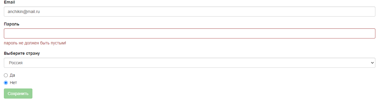 <div class="col-xs-8 col-xs-offset-2"> <form [formGroup]="form" (ngSubmit)="onSubmit()"> <div formGroupName="user"> <div class="form-group" [ngClass]="{'has-error': form.get('user.email').invalid && form.get('user.email').touched}"> <label>Email</label> <input type="text" class="form-control" formControlName="email"> <p class="help-block" *ngIf="form.get('user.email').invalid && form.get('user.email').touched">Не правильно прописан email</p> </div> <div class="form-group" [ngClass]="{'has-error': form.get('user.pass').invalid && form.get('user.pass').touched}"> <label>Пароль</label> <input type="password" class="form-control" formControlName="pass"> <p class="help-block" *ngIf="form.get('user.pass').invalid && form.get('user.pass').touched">пароль не должен быть пустым!</p> </div> </div> <div class="form-group"> <label>Выберите страну</label> <select class="form-control" formControlName="country"> <option value="ru">Россия</option> <option value="by">Белоруссия</option> <option value="ua">Украина</option> </select> </div> <div class="radio" *ngFor="let ans of answers"> <label> <input type="radio" name="answer" formControlName="answer" [value]="ans.type" > {{ans.text}} </label> </div> <button [disabled]="form.invalid" class="btn btn-success" type="submit">Сохранить</button> </form> </div>