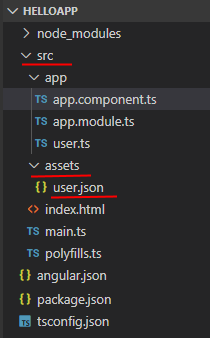 Определим обращение по сети к файлу json, который будет хранить некоторые данные. Папка собственно файлов приложения - это папка src. Поэтому в ней определим новую папку assets. И далее добавим в папку src/assets файл user.json, который будет представлять данные: