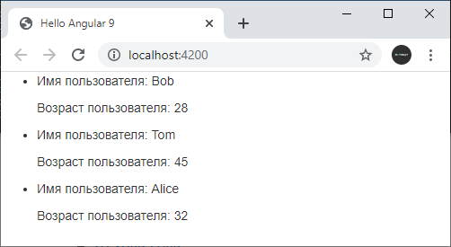 import { Component, OnInit} from '@angular/core'; import { HttpService} from './http.service'; import {User} from './user'; @Component({ selector: 'my-app', template: `<ul> <li *ngFor="let user of users"> <p>Имя пользователя: {{user?.name}}</p> <p>Возраст пользователя: {{user?.age}}</p> </li> </ul>`, providers: [HttpService] }) export class AppComponent implements OnInit { users: User[]=[]; constructor(private httpService: HttpService){} ngOnInit(){ this.httpService.getData().subscribe(data => this.users=data["userList"]); } }
