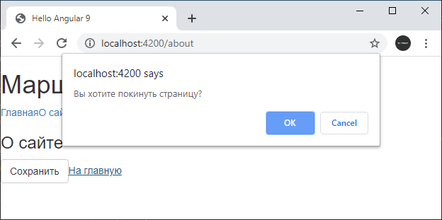 И теперь при попытки ухода с компонента AboutComponent (если saved == false), мы увидим диалоговое окно для подтверждения перехода:
