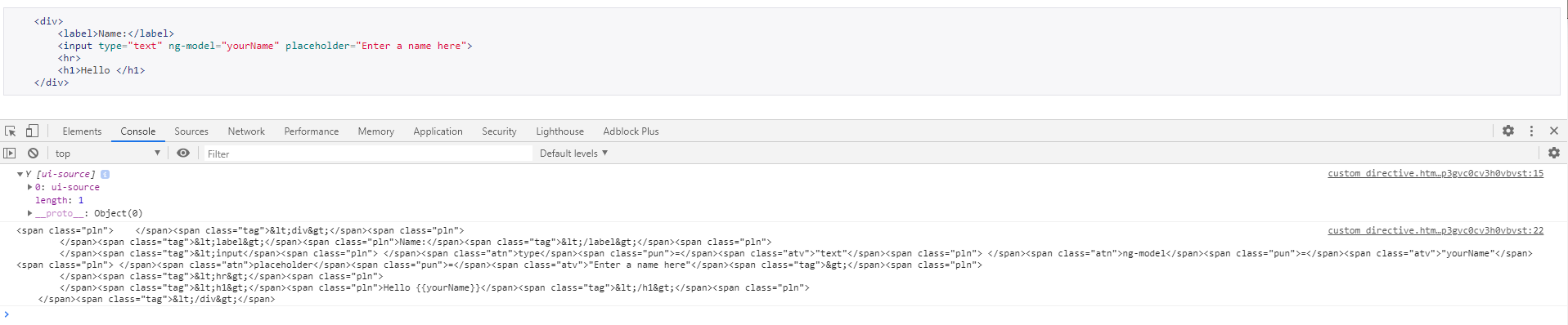 <!DOCTYPE html> <html lang="en" ng-app='app'> <head> <meta charset="UTF-8"> <title></title> <script src="https://ajax.googleapis.com/ajax/libs/angularjs/1.7.9/angular.min.js"></script> <script src="https://cdn.rawgit.com/google/code-prettify/master/loader/run_prettify.js?skin=desert"></script> <script> var app = angular.module('app', []); app.directive('uiSource', function () { return { }; }); </script> </head> <body> <ui-source></ui-source> </body> </html>