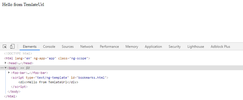 Открываем браузер - ошибок нет, также содержание нашего шаблона Hello from TemlateUrl вывелось в директиве. Если посмотреть в инструменты разработчика в браузере - видно, что именно наш скрипт загрузил шаблон.