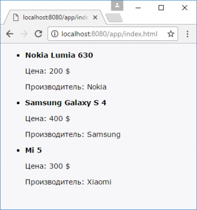 <ul> <li ng-repeat="phone in phones"> <b>{{phone.name}}</b> <p>Цена: {{phone.price}} $</p> <p>Производитель: {{phone.company.name}}</p> </li> </ul>