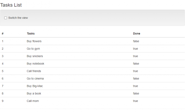 <!DOCTYPE html> <html ng-app="studyModule"> <head> <title>ng-include</title> <!--шаблоные директивы используются для того чтобы генерировать html по шаблону, облегчить работу с коллекциями даных и для добавления базовой логики на страницу--> <script src="../../angular.min%20.js"></script> <link href="../../bootstrap-theme.css" rel="stylesheet" /> <link href="../../bootstrap.css" rel="stylesheet" /> <script> //директива ng-include превосходно подходит для управления partial view //но более часто вам приходится переключатся между небольшими кусками контента который уже содержится в документе и для этого в AngularJS есть директива ng-switch angular.module("studyModule", []) .controller("studyCtrl", function ($scope) { $scope.tasks = [ { action: "Buy flowers", complete: false }, { action: "Go to gym", complete: true }, { action: "Buy snickers", complete: true }, { action: "Buy notebook", complete: false }, { action: "Call friends", complete: true }, { action: "Go to cinema", complete: false }, { action: "Buy Big-Mac", complete: true }, { action: "Buy a book", complete: false }, { action: "Call mom", complete: true } ]; $scope.showFile = function () { return $scope.list ? "../list.html" : "../table.html"; }; $scope.displayMessage = function () { console.log("Content: " + $scope.showFile()); }; }); </script> </head> <body> <div id="tasksPanel" class="panel" ng-controller="studyCtrl"> <h3 class="panel-header">Tasks List</h3> <div class="well"> <div class="checkbox"> <label> <input type="checkbox" ng-model="list" /> Switch the view </label> </div> </div> <div ng-include="showFile()" onload="displayMessage()"></div> <!--displayMessage() фунция, которая будет вызваться в момент загрузки дива--> <!--аттрибут ng-include может быть применен к любому html элементу--> </div> </body> </html>