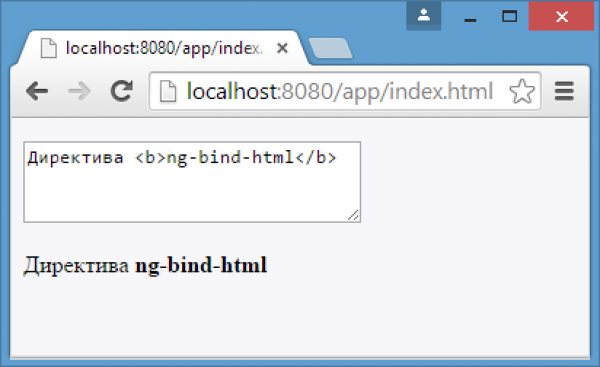 <!doctype html> <html ng-app="myApp"> <head> <meta charset="utf-8"> </head> <body> <div ng-controller="helloController"> <p><textarea ng-model="htmlcode"></textarea></p> <p ng-bind-html="htmlcode"></p> </div> <script src="js/lib/angular.min.js"></script> <script src="js/lib/angular-sanitize.min.js"></script> <script type="text/javascript"> var myApp = angular.module('myApp', ["ngSanitize"]); myApp.controller('helloController', function($scope) { $scope.htmlcode="Директива <b>ng-bind-html</b>"; }); </script> </body> </html>