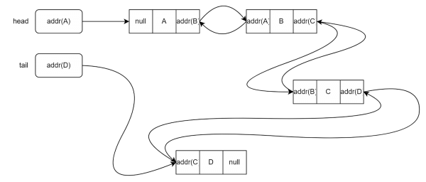 В каждом узле двусвязного списка хранится две ссылки — на следующий и на предыдущий узел. Кроме того, в нем хранятся ссылки и на голову списка (первый элемент), и на его хвост (последний элемент):