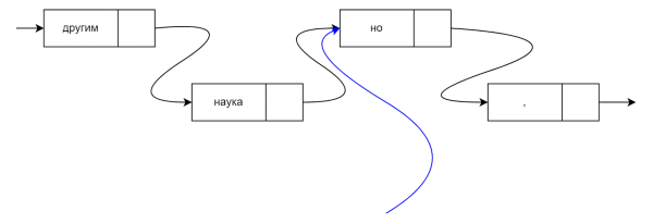 Односвязный список устроен так, что для вставки запятой между словами «наука» и «но» нужно модифицировать именно узел со словом «наука». Эти детали делают наш возможный алгоритм сложным и медленным.