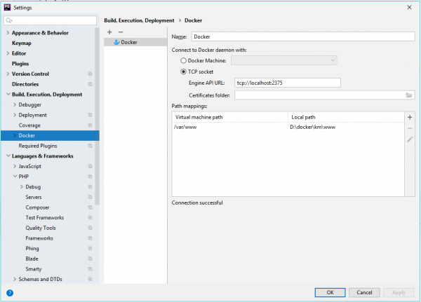 Если PhpStorm не смог установить соединение через порт 2375 - Настраиваем docker на прием входящих подключений через порт 2375.