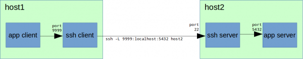 Имеем удаленный сервер «host2» с неким приложением, допустим, PostgreSQL server, которое принимает TCP-соединения на порту 5432. При этом вполне логично, что на этом сервере стоит файрвол, который прямых соединений извне на порт 5432 не разрешает, но при этом есть доступ по SSH (по-умолчанию порт 22, рекомендую его изменить). Требуется подключиться с нашего рабочего места «host1» клиентским приложением к серверу PostgreSQL на «host2».
