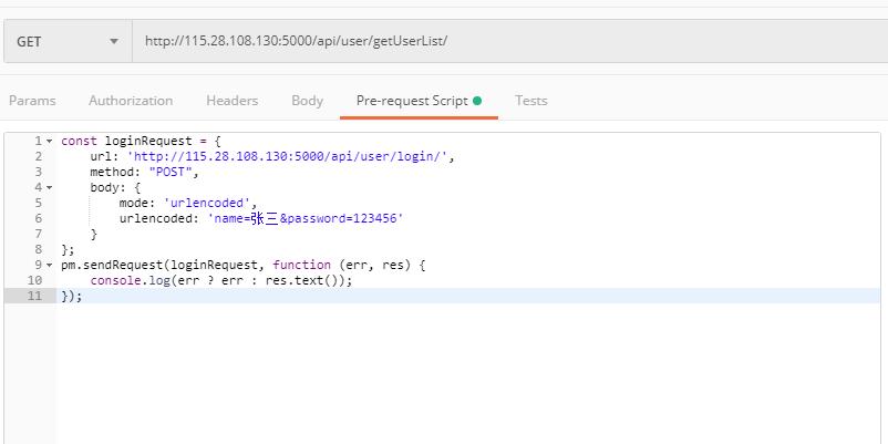 //Construct a login request const loginRequest = { url: 'http://115.28.108.130:5000/api/user/login/', method: "POST", body: { mode: 'urlencoded', // The mode is the form URL encoding mode urlencoded: 'name= &password=123456' } }; // send request pm.sendRequest(loginRequest, function (err, res) { console.log(err ? err : res.text()); });
