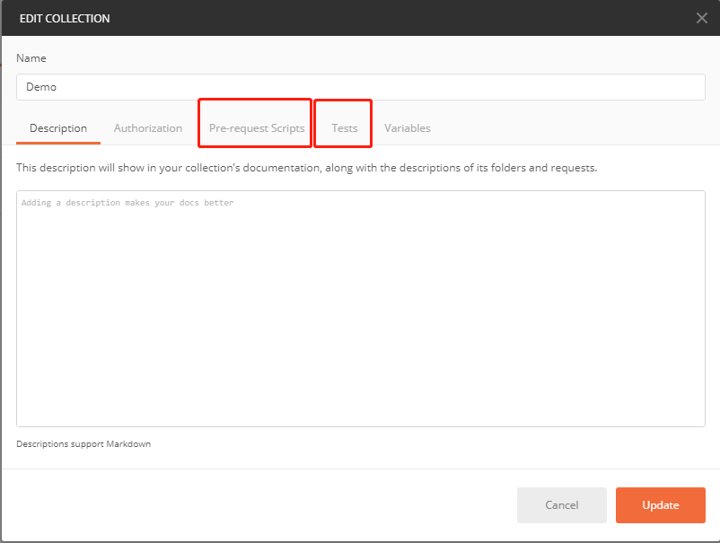 Коллекция Postman's (collection)/Папка (collection subfolder)/Запрос (request) имеет две области скриптов: сценарий предварительного запроса и тесты, которые можно использовать до и после отправки скрипта запроса (на основе Javascript для достижения различных операционных)