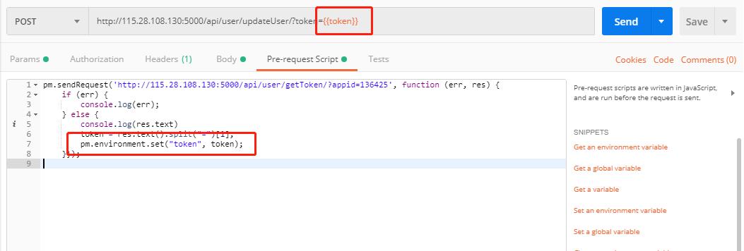 const url = 'http://115.28.108.130:5000/api/user/getToken/?appid=136425'; // send get request pm.sendRequest(url, function (err, res) { console.log(err ? err : res.text()); // The console prints the request text });