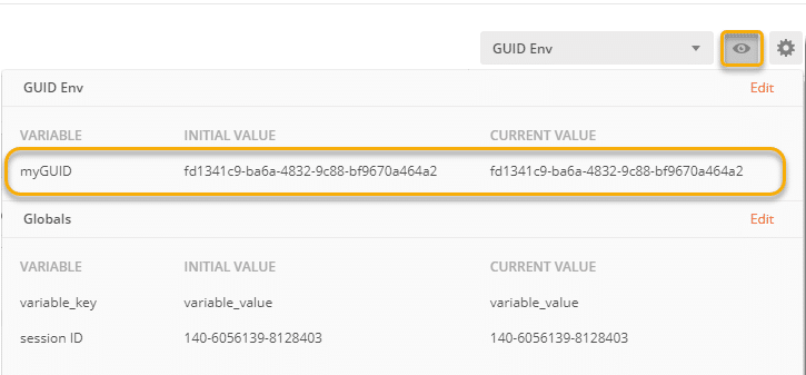 Теперь снова выполните запрос и просмотрите переменные среды, щелкнув значок глаза.