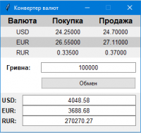 from tkinter import * from tkinter import ttk import urllib.request import json from tkinter import messagebox root = Tk() root.title('Конвертер валют') winx = 300 winy =250 x = (root.winfo_screenwidth()/2 - winx/2) y = (root.winfo_screenheight()/2 - root.winfo_reqheight()/2) root.wm_geometry("%dx%d+%d+%d" % (winx,winy,x, y)) root.resizable(False, False) START_AMOUNT = 100000 # Functions def exchange(): e_usd.delete(0, END) e_eur.delete(0, END) e_rur.delete(0, END) try: e_usd.insert(0, round(float(e_uah.get()) / float(JSON_object[0]['sale']), 2)) e_eur.insert(0, round(float(e_uah.get()) / float(JSON_object[1]['sale']), 2)) e_rur.insert(0, round(float(e_uah.get()) / float(JSON_object[2]['sale']), 2)) except: messagebox.showwarning('Warning', 'Проверьте введенную сумму') try: html = urllib.request.urlopen('https://api.privatbank.ua/p24api/pubinfo?json&exchange&coursid=5') data = html.read() JSON_object = json.loads(data) except: messagebox.showerror("Error", 'Ошибка получения курсов валют') # Header Frame header_frame = Frame(root) header_frame.pack(fill=X) header_frame.grid_columnconfigure(0, weight=1) header_frame.grid_columnconfigure(1, weight=1) header_frame.grid_columnconfigure(2, weight=1) # Header h_currency = Label(header_frame, text="Валюта", bg="#ccc", font="Arial 12 bold") h_currency.grid(row=0, column=0, sticky=EW) h_buy = Label(header_frame, text="Покупка", bg="#ccc", font="Arial 12 bold") h_buy.grid(row=0, column=1, sticky=EW) h_sale = Label(header_frame, text="Продажа", bg="#ccc", font="Arial 12 bold") h_sale.grid(row=0, column=2, sticky=EW) # USD course usd_currency = Label(header_frame, text="USD", font="Arial 10") usd_currency.grid(row=1, column=0, sticky=EW) usd_buy = Label(header_frame, text=JSON_object[0]['buy'], font="Arial 10") usd_buy.grid(row=1, column=1, sticky=EW) usd_sale = Label(header_frame, text=JSON_object[0]['sale'], font="Arial 10") usd_sale.grid(row=1, column=2, sticky=EW) # EUR course eur_currency = Label(header_frame, text="EUR", bg="#ccc", font="Arial 10") eur_currency.grid(row=2, column=0, sticky=EW) eur_buy = Label(header_frame, text=JSON_object[1]['buy'], bg="#ccc", font="Arial 10") eur_buy.grid(row=2, column=1, sticky=EW) eur_sale = Label(header_frame, text=JSON_object[1]['sale'], bg="#ccc", font="Arial 10") eur_sale.grid(row=2, column=2, sticky=EW) # RUR course rur_currency = Label(header_frame, text="RUR", font="Arial 10") rur_currency.grid(row=3, column=0, sticky=EW) rur_buy = Label(header_frame, text=JSON_object[2]['buy'], font="Arial 10") rur_buy.grid(row=3, column=1, sticky=EW) rur_sale = Label(header_frame, text=JSON_object[2]['sale'], font="Arial 10") rur_sale.grid(row=3, column=2, sticky=EW) # Calc Frame calc_frame = Frame(root, bg="#fff") calc_frame.pack(expand=1, fill=BOTH) calc_frame.grid_columnconfigure(1, weight=1) # UAH l_uah = Label(calc_frame, text="Гривна:", bg="#fff", font="Arial 10 bold") l_uah.grid(row=0, column=0, padx=10) e_uah = ttk.Entry(calc_frame, justify=CENTER, font="Arial 10") e_uah.grid(row=0, column=1, columnspan=2, pady=10, padx=10, sticky=EW) e_uah.insert(0, START_AMOUNT) # Button btn_calc = ttk.Button(calc_frame, text="Обмен", command=exchange) btn_calc.grid(row=1, column=1, columnspan=2, sticky=EW, padx=10) # Result Frame res_frame = Frame(root) res_frame.pack(expand=1, fill=BOTH, pady=5) res_frame.grid_columnconfigure(1, weight=1) # USD l_usd = Label(res_frame, text="USD:", font="Arial 10 bold") l_usd.grid(row=2, column=0) e_usd = ttk.Entry(res_frame, justify=CENTER, font="Arial 10") e_usd.grid(row=2, column=1, columnspan=2, padx=10, sticky=EW) e_usd.insert(0, round(START_AMOUNT / float(JSON_object[0]['sale']), 2)) # EUR l_eur = Label(res_frame, text="EUR:", font="Arial 10 bold") l_eur.grid(row=3, column=0) e_eur = ttk.Entry(res_frame, justify=CENTER, font="Arial 10") e_eur.grid(row=3, column=1, columnspan=2, padx=10, sticky=EW) e_eur.insert(0, round(START_AMOUNT / float(JSON_object[1]['sale']), 2)) # RUR l_rur = Label(res_frame, text="RUR:", font="Arial 10 bold") l_rur.grid(row=4, column=0) e_rur = ttk.Entry(res_frame, justify=CENTER, font="Arial 10") e_rur.grid(row=4, column=1, columnspan=2, padx=10, sticky=EW) e_rur.insert(0, round(START_AMOUNT / float(JSON_object[2]['sale']), 2)) root.mainloop()