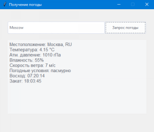 from tkinter import ttk from ttkthemes import ThemedTk import requests from tkinter import messagebox import time API_KEY = '5e1ce895b1f7950c8267adecc8ce4989' API_URL = 'https://api.openweathermap.org/data/2.5/weather' # https://api.openweathermap.org/data/2.5/weather?appid=key&q=kiev,ua def setGeometry(win, winx, winy):#Функция выравнивает окно по центру x = (win.winfo_screenwidth() / 2 - winx / 2) y = (win.winfo_screenheight() / 2 - winy / 2) win.geometry("%dx%d+%d+%d" % (winx, winy, x, y)) def print_weather(weather): try: city = weather['name'] country = weather['sys']['country'] temp = weather['main']['temp'] press = weather['main']['pressure'] humidity = weather['main']['humidity'] wind = weather['wind']['speed'] desc = weather['weather'][0]['description'] sunrise_ts = weather['sys']['sunrise'] sunset_ts = weather['sys']['sunset'] sunrise_struct_time = time.localtime(sunrise_ts) sunset_struct_time = time.localtime(sunset_ts) sunrise = time.strftime("%H:%M:%S", sunrise_struct_time) sunset = time.strftime("%H:%M:%S", sunset_struct_time) return f"Местоположение: {city}, {country} \nТемпература: {temp} °C \nАтм. давление: {press} гПа \nВлажность: {humidity}% \nСкорость ветра: {wind} м/с \nПогодные условия: {desc} \nВосход: {sunrise} \nЗакат: {sunset}" except: return "Ошибка получения данных..." def get_weather(event=''): if not entry.get(): messagebox.showwarning('Warning', 'Введите запрос в формате city,country_code') else: label['text'] = "Идет загрузка данных..." root.update() params = { "appid": API_KEY, "q": entry.get(), "units": "metric", "lang": "ru" } r = requests.get(API_URL, params=params) weather = r.json() label['text'] = print_weather(weather) root = ThemedTk(theme="arc") setGeometry(root, 500, 400) root.resizable(0, 0) root.title('Получение погоды') s = ttk.Style() s.configure("TLabel", padding=5, font="Arial 11") top_frame = ttk.Frame(root) top_frame.place(relx=0.5, rely=0.1, relwidth=0.9, relheight=0.1, anchor='n') entry = ttk.Entry(top_frame) entry.place(relwidth=0.7, relheight=1) button = ttk.Button(top_frame, text="Запрос погоды", command=get_weather) button.place(relx=0.7, relwidth=0.3, relheight=1) lower_frame = ttk.Frame(root) lower_frame.place(relx=0.5, rely=0.25, relwidth=0.9, relheight=0.6, anchor='n') label = ttk.Label(lower_frame, anchor="nw") label.place(relwidth=1, relheight=1) entry.bind("<Return>", get_weather) root.mainloop()